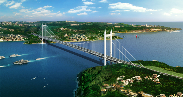 博斯普魯斯海峽第三大橋連接海峽北部的Garipce和Poyraz,橋長為約1.3km。大橋?yàn)橹骺?408...
